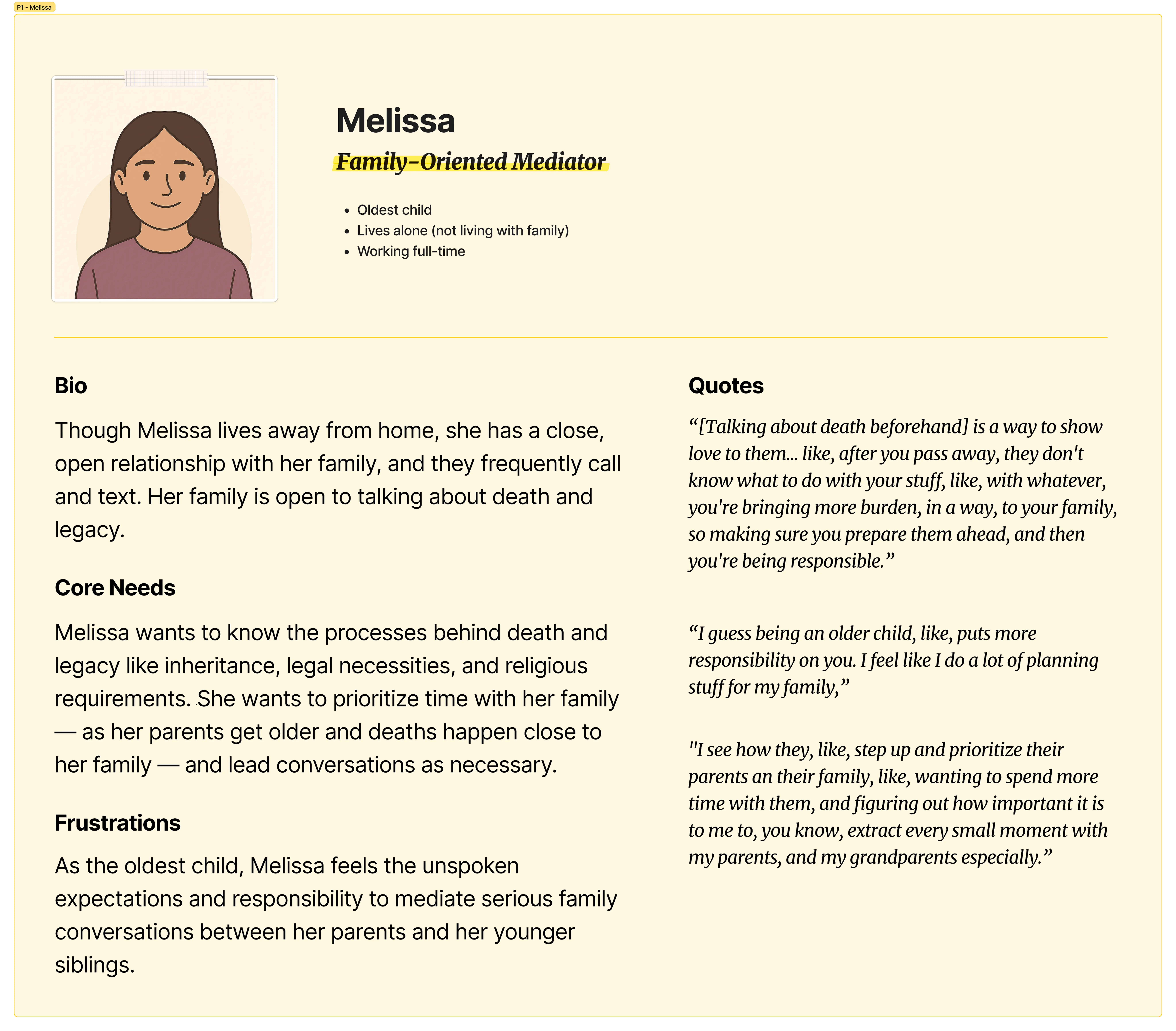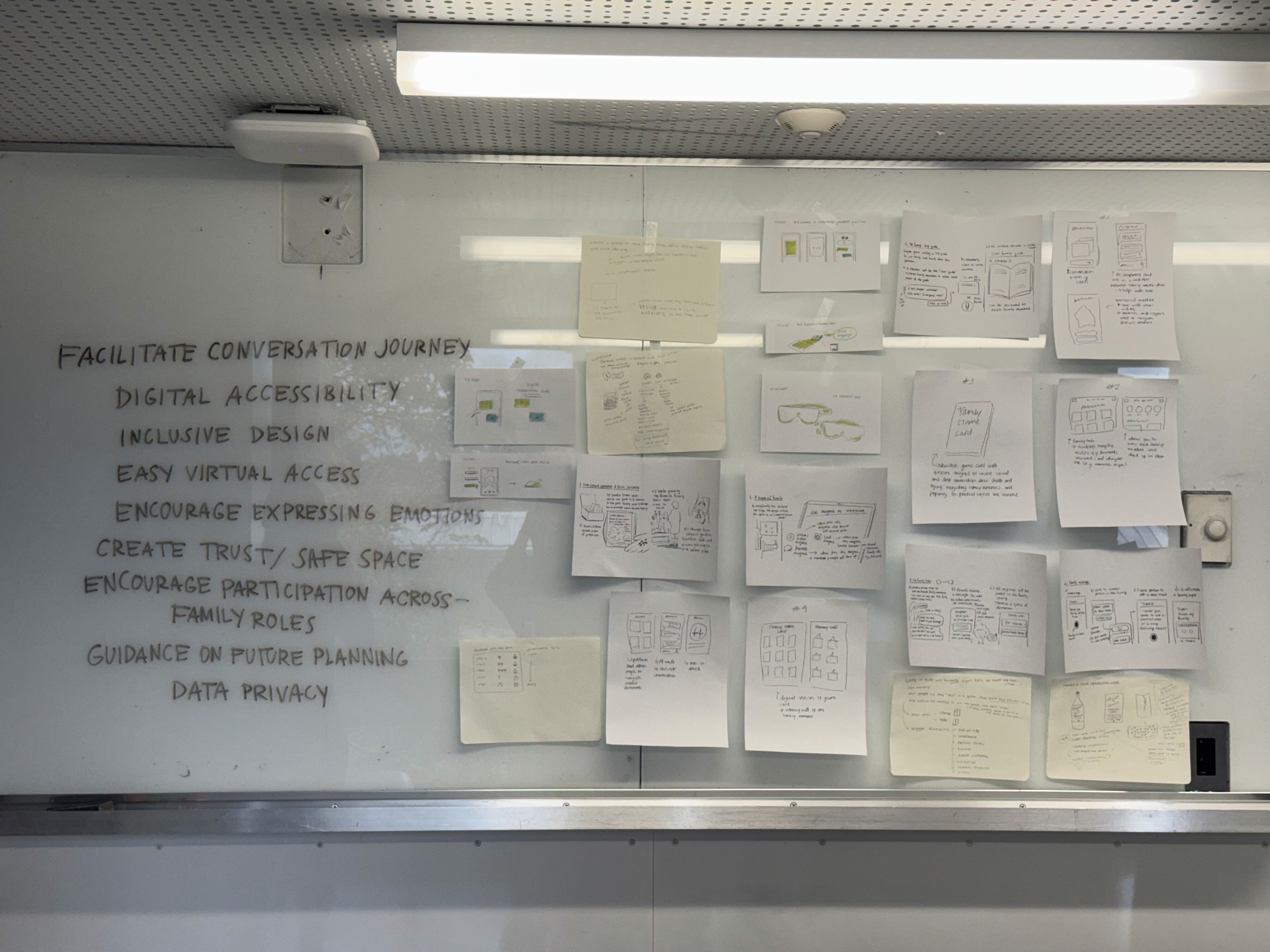 We started this project assuming families weren't talking at all. Our research proved us wrong — and sharpened the real problem. Most families had already had these conversations. But they covered the paperwork, not the person. Interviews revealed that meaningful conversations tended to happen only after a crisis — a death, a diagnosis, a health scare. Outside those moments, families defaulted to surface-level logistics or avoided the topic entirely. Young adults wanted to go deeper. They just didn't know how — or when — to start.