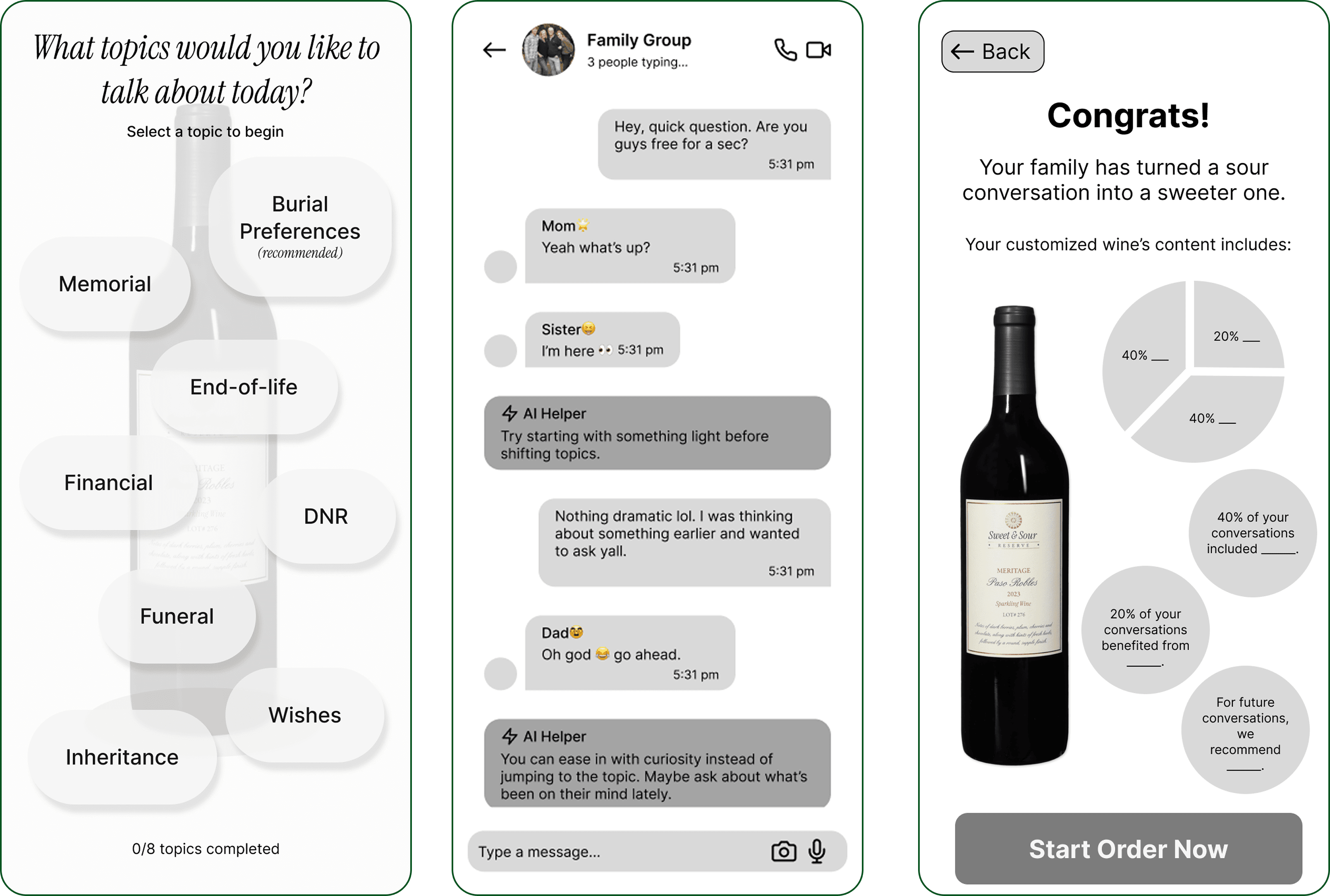 We addressed Melissa and Charlie’s needs using a wine fermentation metaphor. This concept encourages families who are living apart to participate in difficult conversations about death and legacy and provides an incentive through a physical customized wine/beverage. This was presented during an in-class peer review.